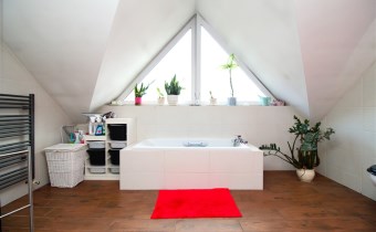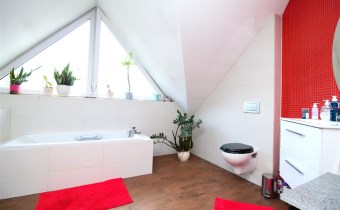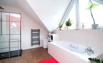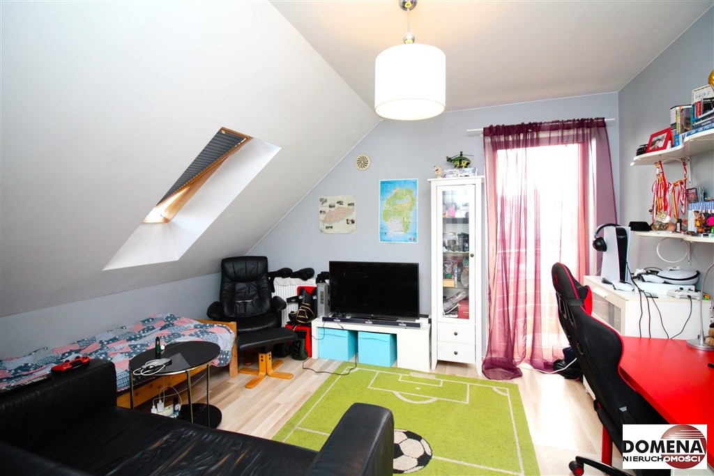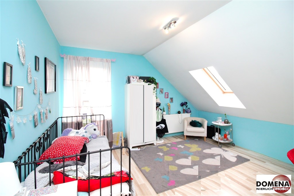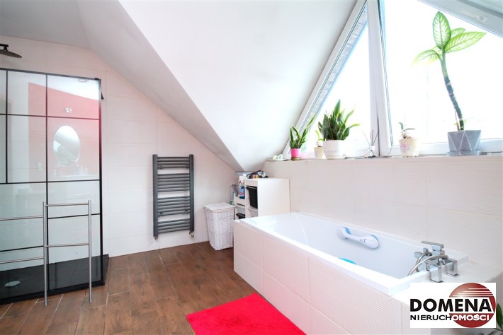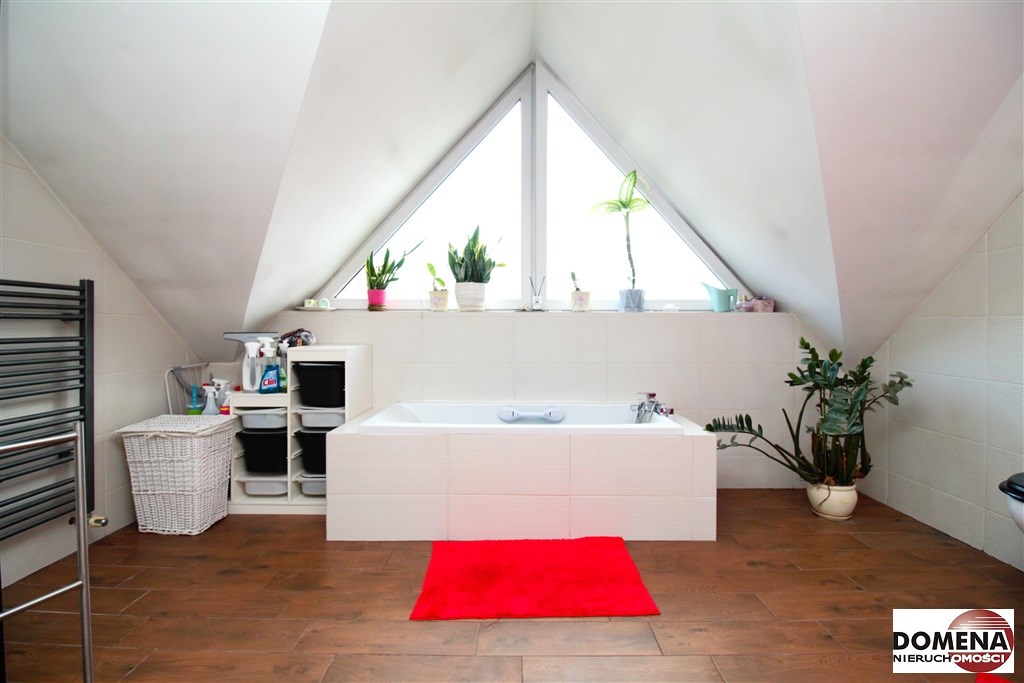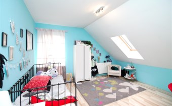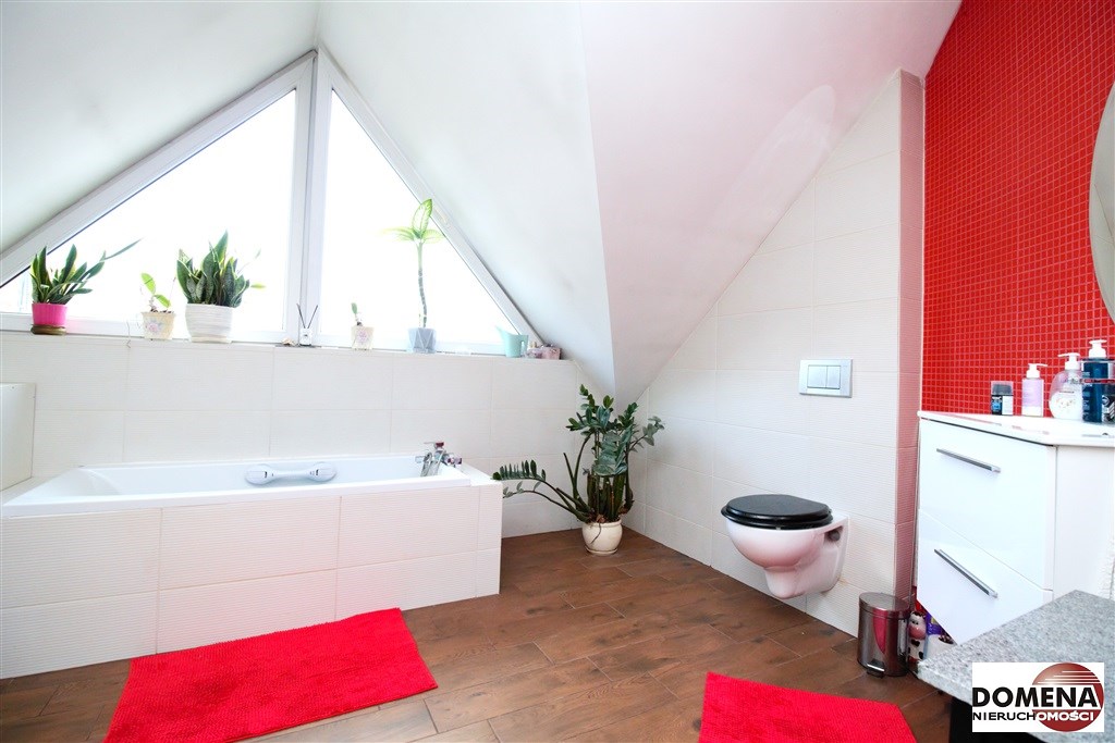 Piętro: 3 niezależne pokoje (jeden z dużą garderobą), duża łazienka z wanną i prysznicem, korytarz.