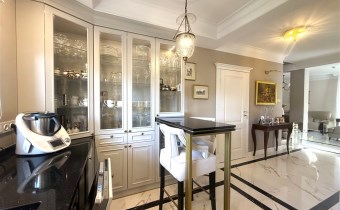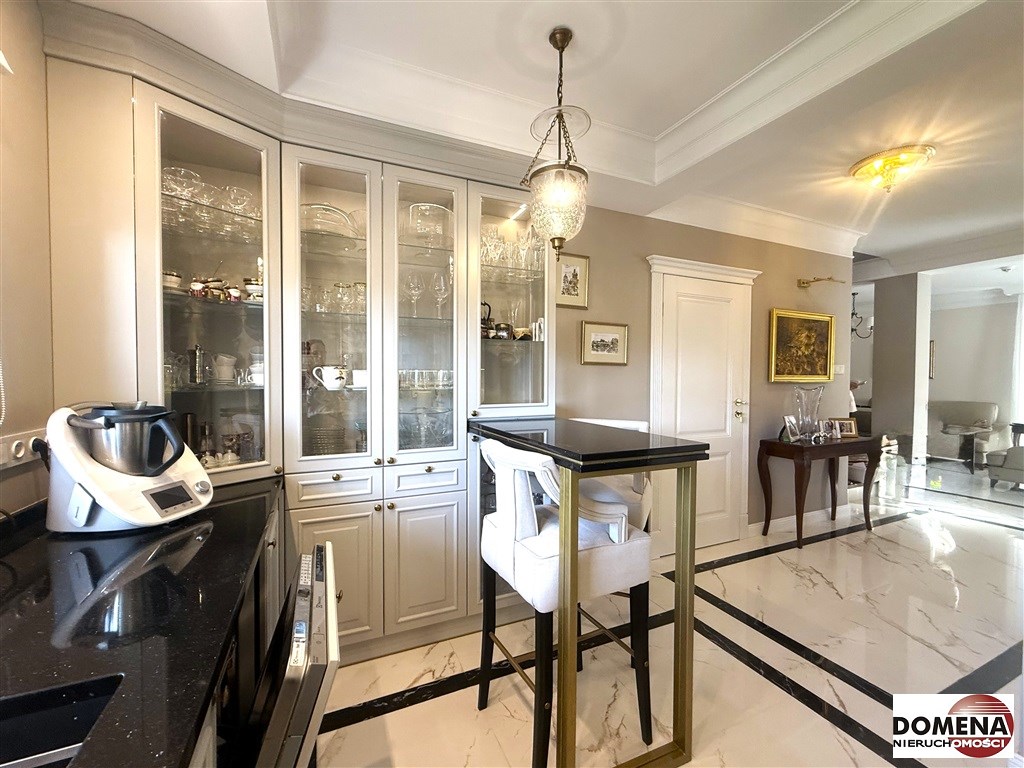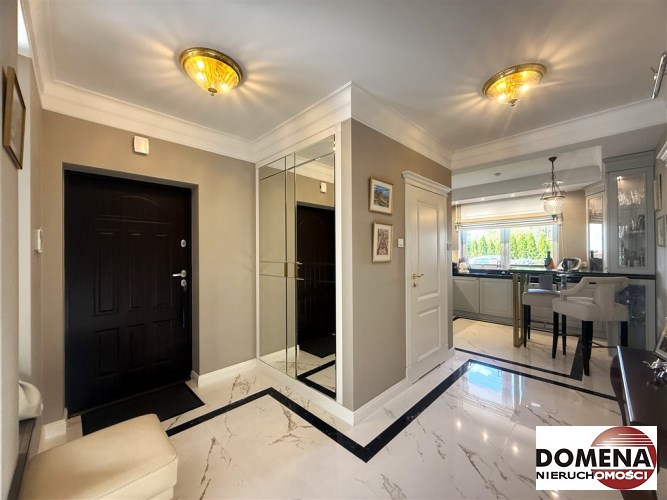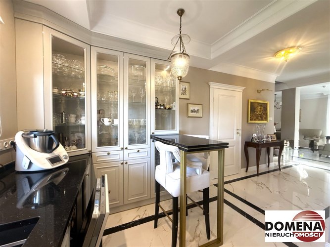 AGD: zmywarka, płyta indukcyjna, lodówka, okap; zabudowa stała korytarza oraz garderób; meble ruchome - stół z krzesłami z salonu, biblioteka/regał z pokoju na górze.