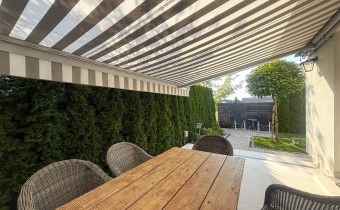 pięknym trawnikiem; podjazd wyłożony polbrukiem z dodatkowym miejscem do parkowania. Kameralny