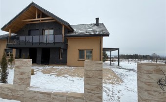 Wykończenie na zewnątrz: balkony wyłożone deską tarasową drewnianą modrzew syberyjski, zadaszenie tarasu pergolą aluminiową z dachem z poliwęglanu; elewacja z wykorzystaniem płyty HPL Black Marble, drzwi wejściowe marki Wikend dodatkowo docieplone; polbruki; pełne ogrodzenie - murowane słupki z wypełnieniem z bramą i furtką.