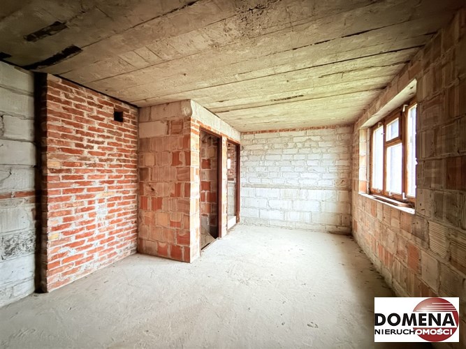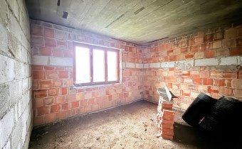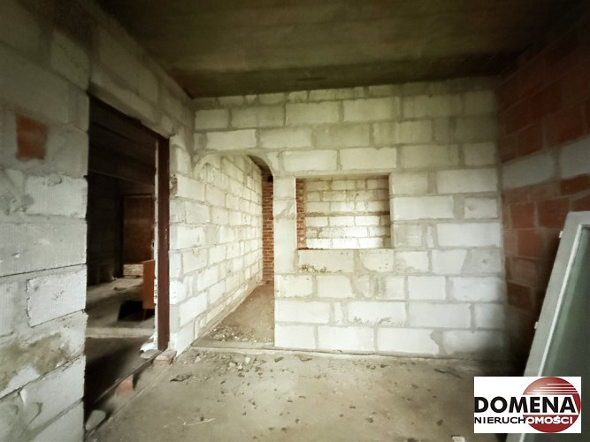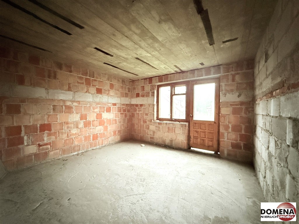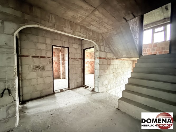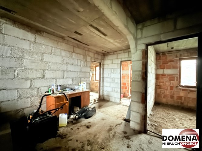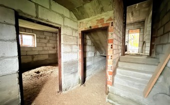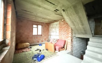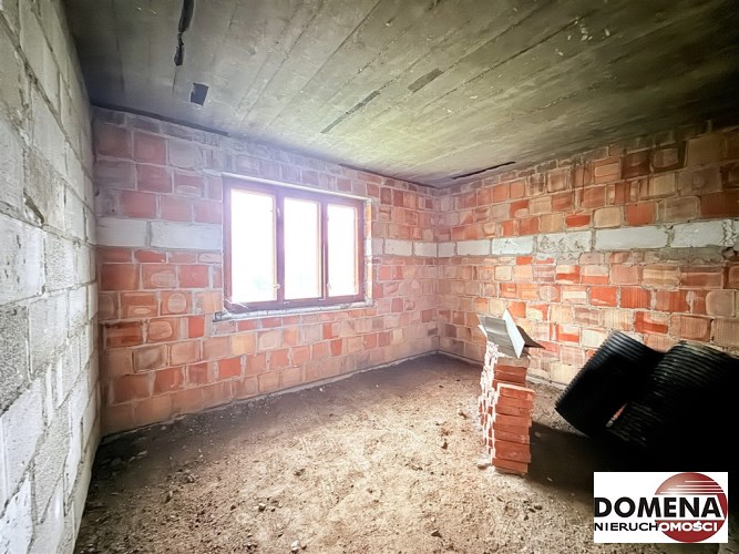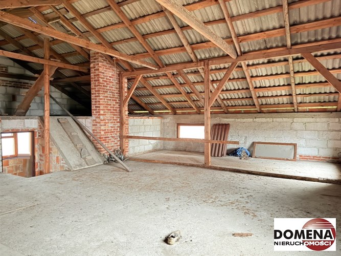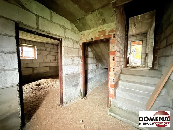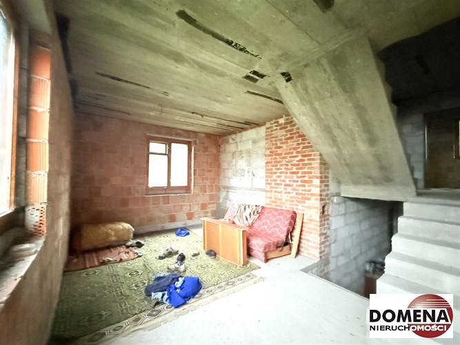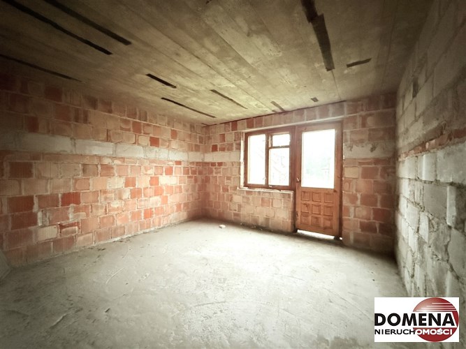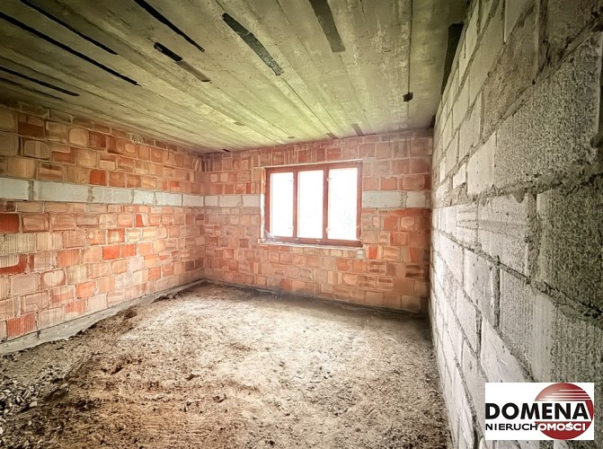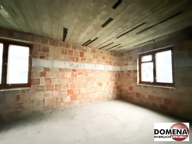 Dom w stanie surowym otwartym bez elewacji do wykończenia; okna drewniane do wymiany.