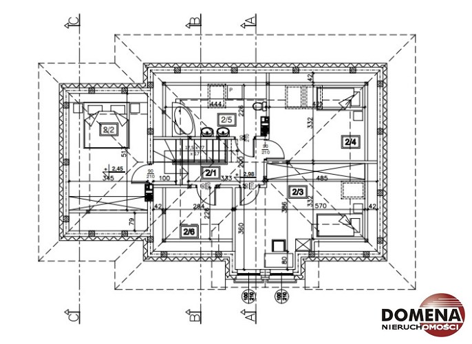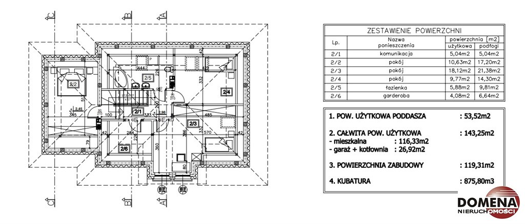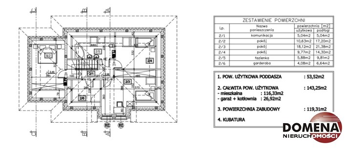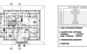 Poddasze użytkowe: 4 sypialnie (garderoba), duża łazienka z WC, korytarz.