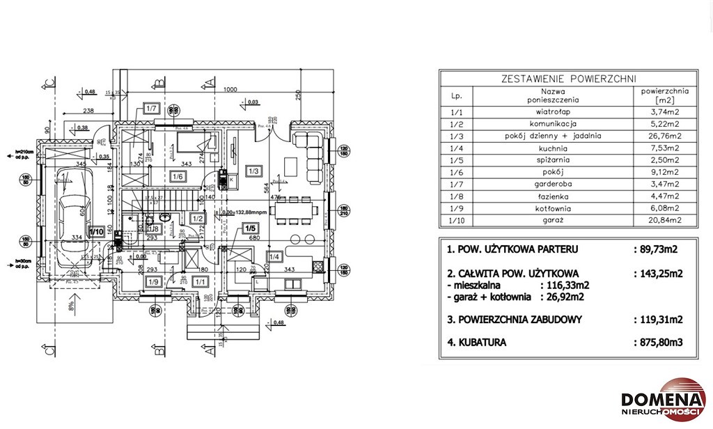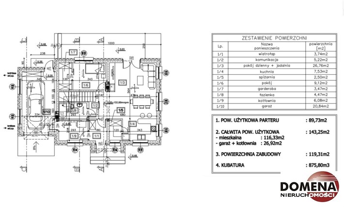 Parter: salon z jadalnią z miejscem na kominek i wyjściem na taras, pokój, kuchnia, łazienka, WC, garaż 1-stanowiskowy w bryle budynku.