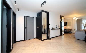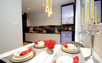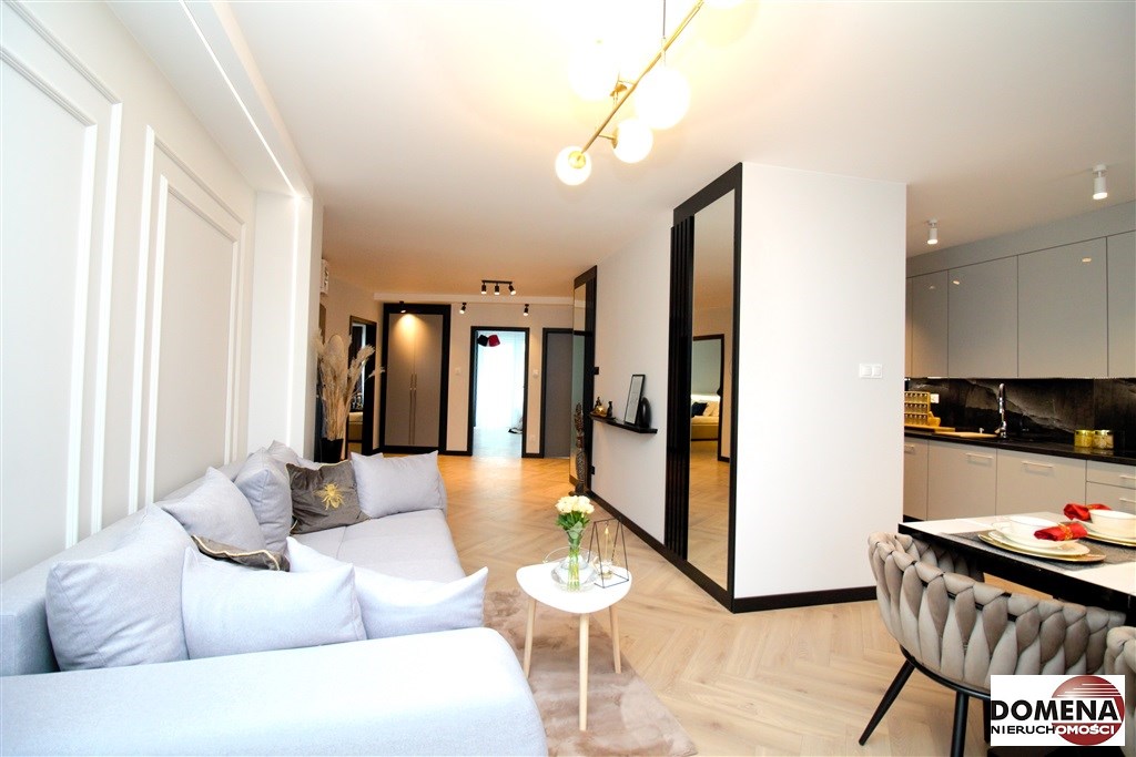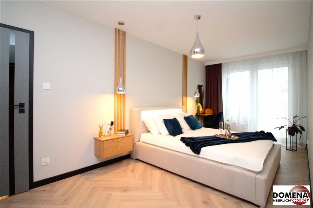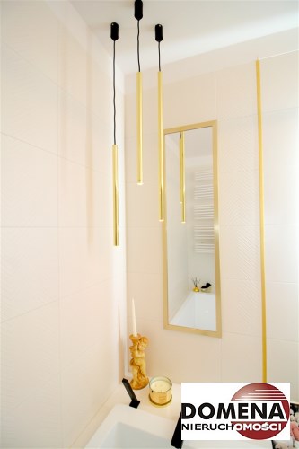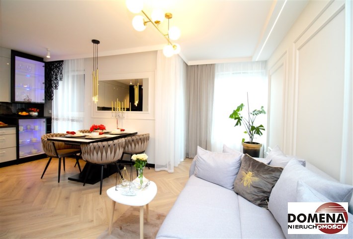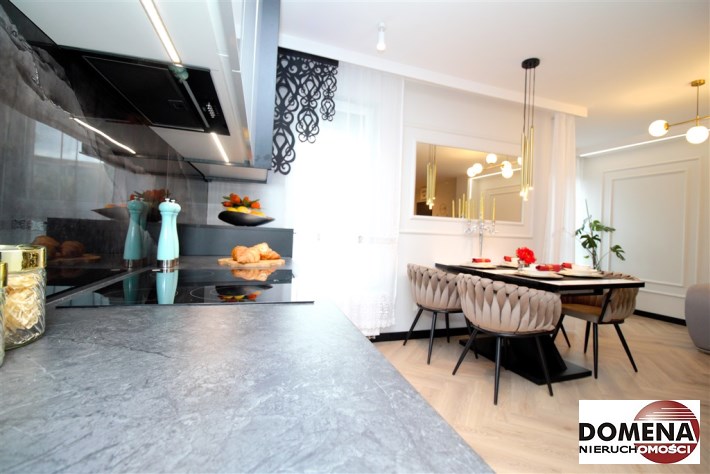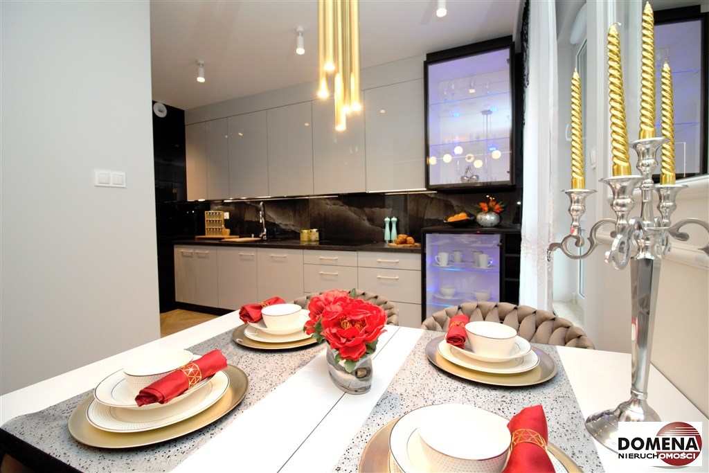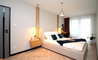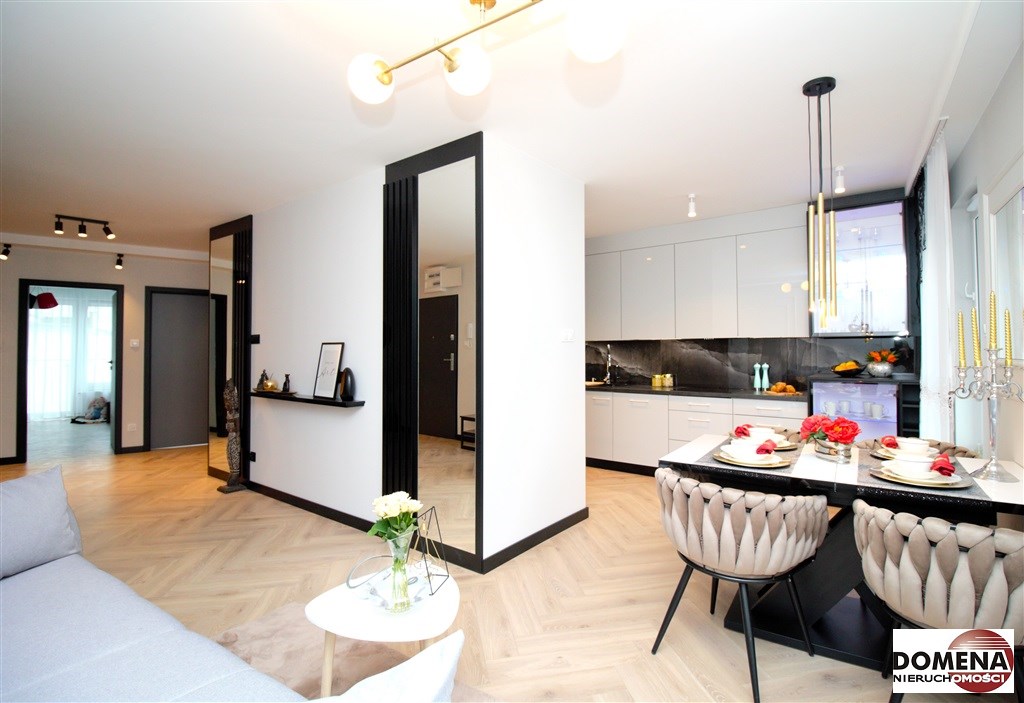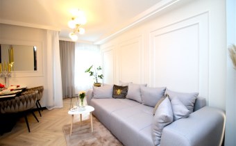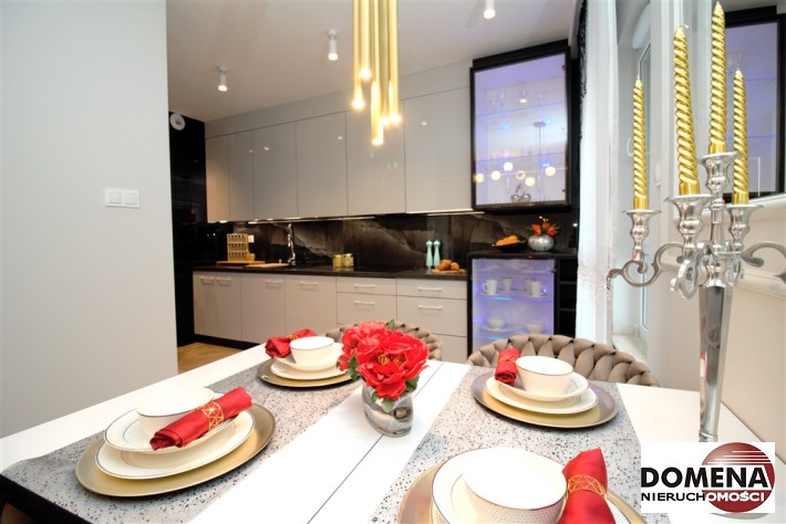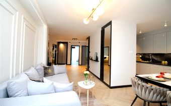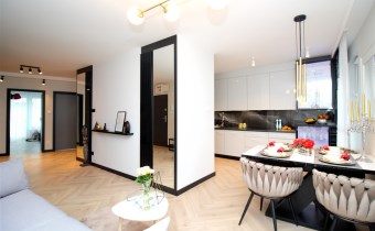 Mieszkanie wykończone w podwyższonym standardzie z dbałością o szczegóły - wybór harmonijnych kolorów ścian i mebli; dobór wysokiej jakości materiałów i dodatków, które nadają elegancji i luksusowego wyglądu. Zastosowanie designerskiego oświetlenia, takiego jak lampy wiszące - tworzą przytulną i stylową atmosferę. Drobne dodatki - plakaty, ramki ze zdjęciami, rośliny czy dekoracyjne poduszki, nadają charakteru i osobowości mieszkaniu.