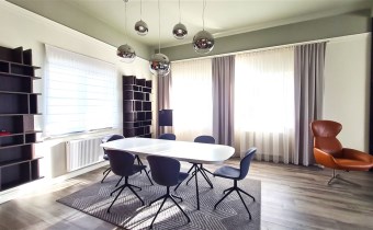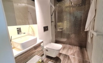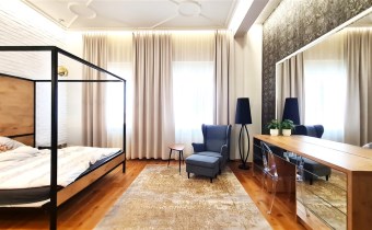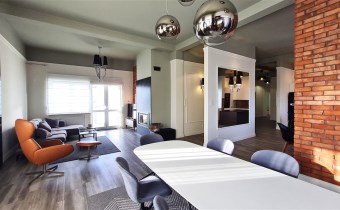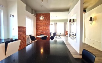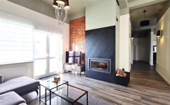 Na powierzchnię apartamentu 220m2 zlokalizowanego na 1 poziomie składa się: przestronny salon z kominkiem z rozprowadzeniem ogrzewania ciepłym powietrzem, oraz wyjściem na duży balkon (ok.10m2), kuchnia z wyspą w formie aneksu z jadalnią, 3 sypialnie, pokój do pracy z garderobą, 2 pomieszczenia gospodarcze, 2 łazienki z WC, korytarz.