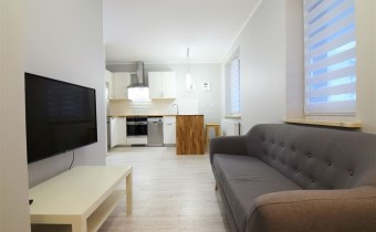 Mieszkanie wykończone w nowoczesnym stylu. Na powierzchni 34m2 znajduje się salon z kuchnią w formie aneksu, osobna sypialnia, łazienka z WC i prysznicem.