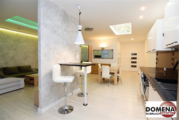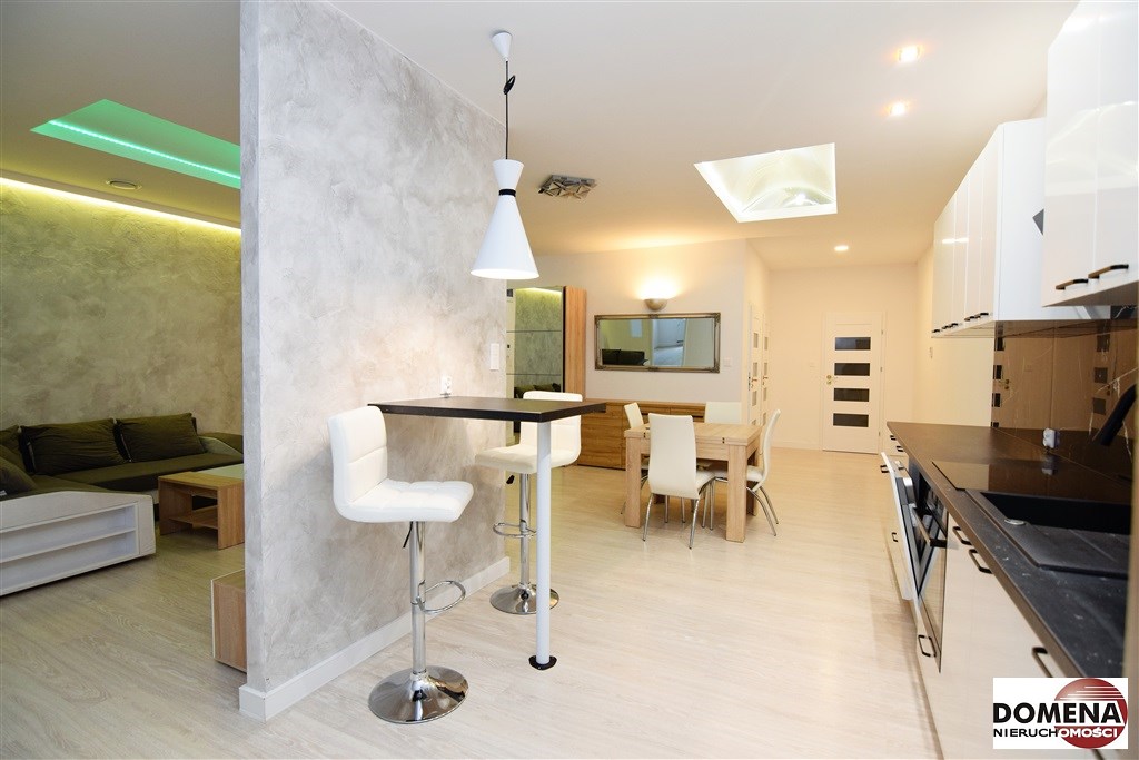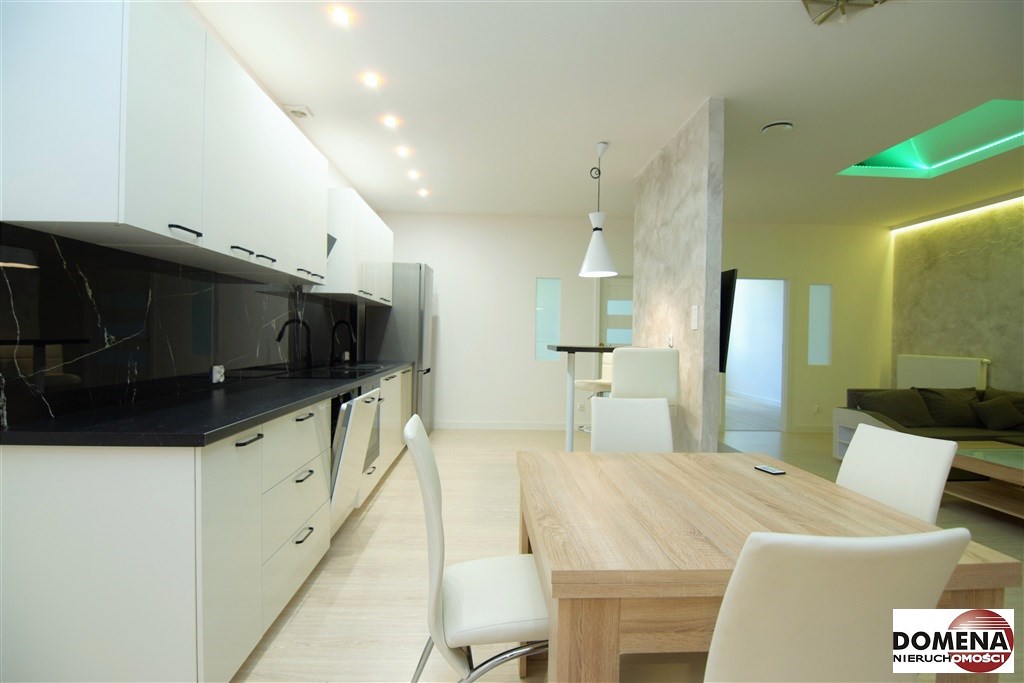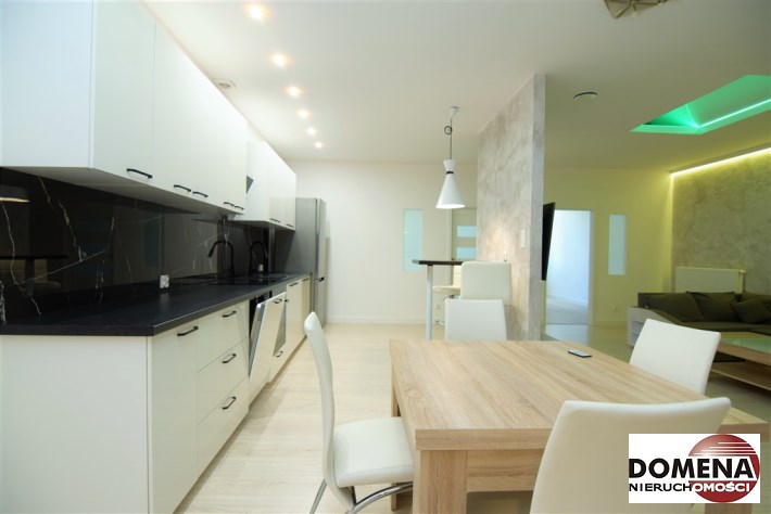 Apartament wyposażony w zabudowę stałą kuchni z AGD: blat indukcyjny, piekarnik elektryczny, okap, zmywarka, lodówka, oraz wyposażenie ruchome widoczne na zdjęciach.